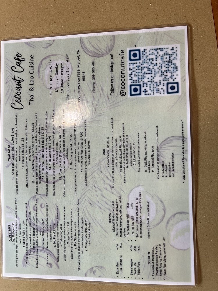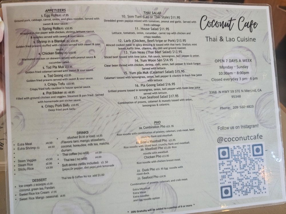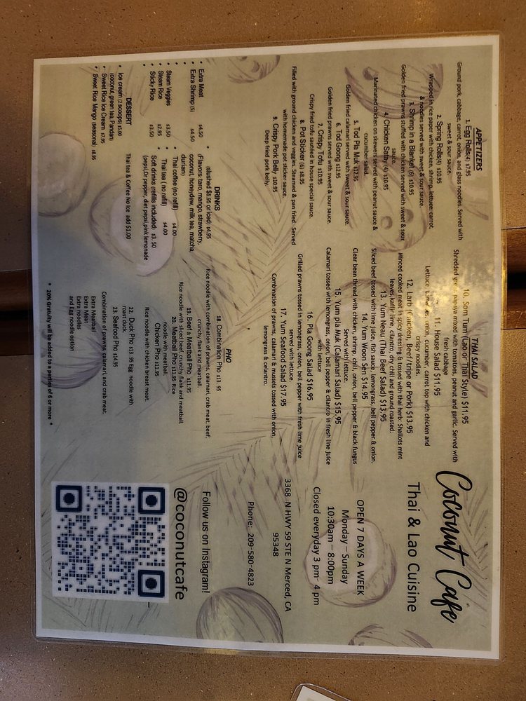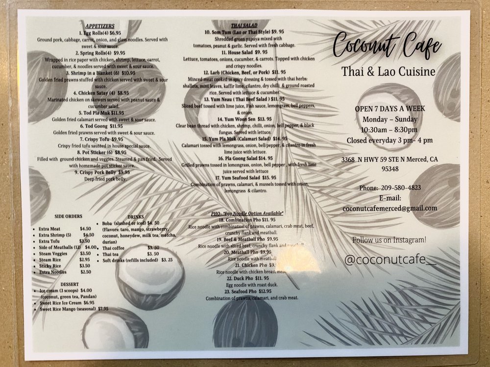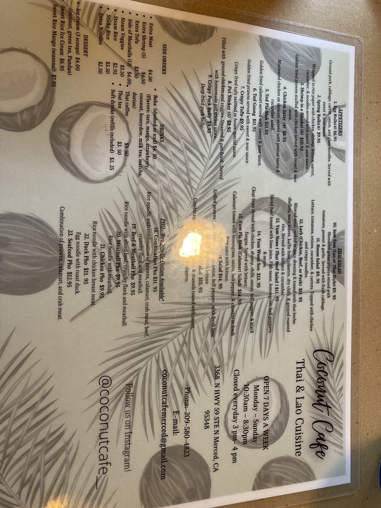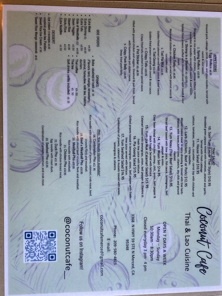 Welcome to Coconut Cafe, a delightful haven in Merced, where Laotian and Thai flavors shine, complemented by a focused seafood selection. Nestled at 3368 N State Hwy 59 STE N, it’s a place that embraces both the casual and trendy with ADA-compliant access, outdoor seating, and a welcoming atmosphere.